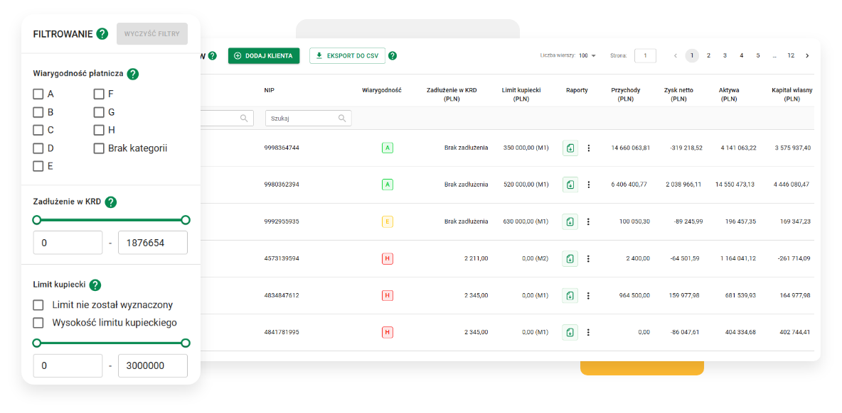 Przeglądasz szczegółową listę klientów z kluczowymi informacjami o ich sytuacji. Wygodne filtry pozwalają sprawnie analizować portfel klientów, a eksport do CSV umożliwia łatwe wykorzystanie danych w Twoich systemach. Gdy coś wzbudzi Twoją uwagę, możesz od razu pobrać pełny raport o firmie. Dowiedz się więcej o raportach.