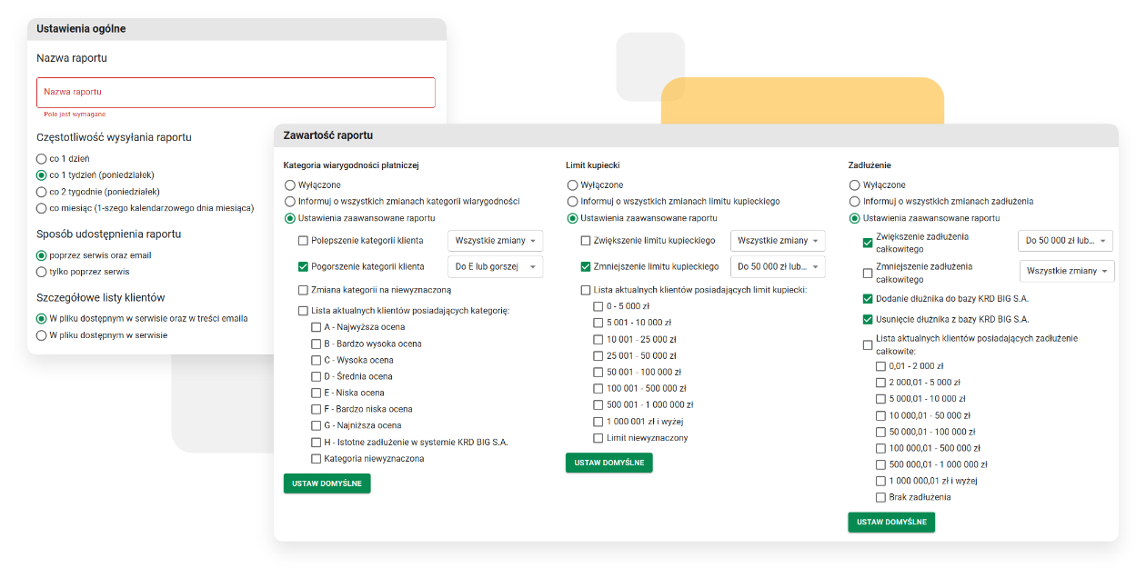 Niektóre zmiany w sytuacji klientów mogą mieć kluczowe znaczenie dla Twojego firmy - szczególnie przy wysokiej ekspozycji kredytowej. RiskRadar umożliwia ustawienie cyklicznych raportów monitorujących: