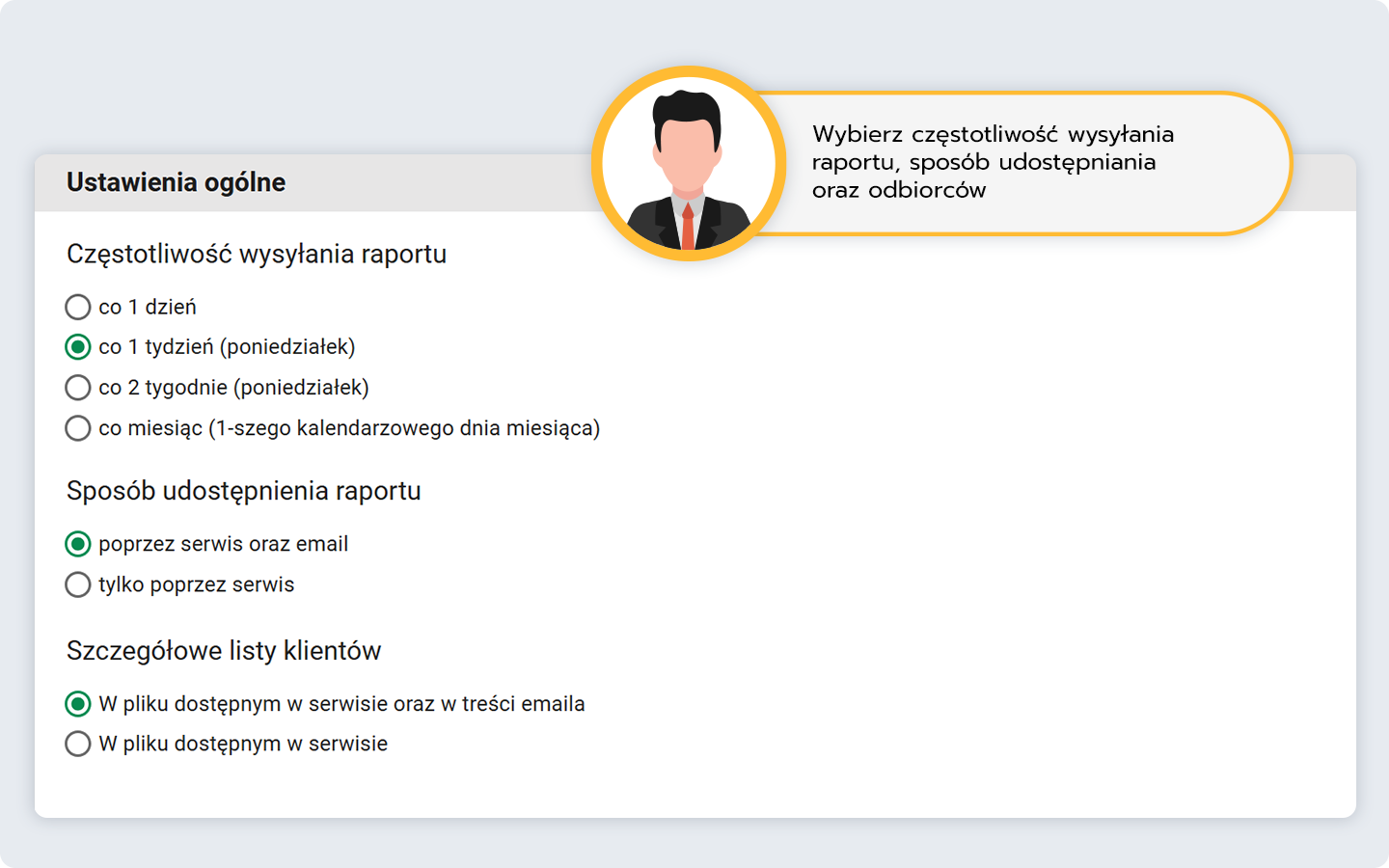 Wybierz częstotliwość wysyłki, sposób udostępniania raportu oraz szczegółowe listy klientów.