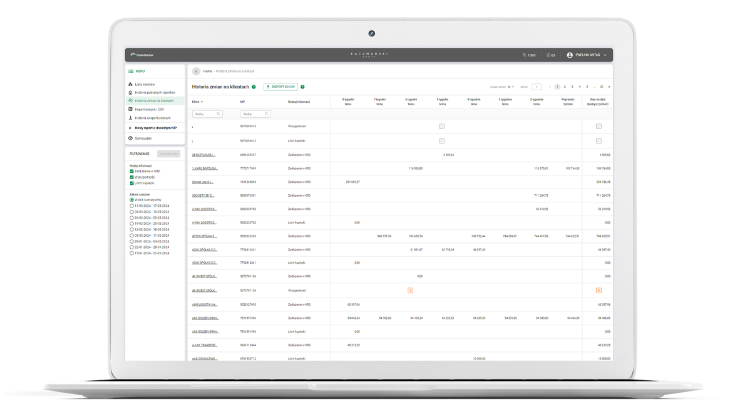 W historii zmian uwzględnieni są tylko klienci z aktualnie włączonym monitorowaniem, dla których w ostatnich 8 tygodniach wstecz wystąpiły zmiany salda zadłużenia w KRD (wyrażone w PLN) i/lub Kategorii Wiarygodności Płatniczej i/lub limitu kupieckiego (wyrażone w PLN). Wartości w poszczególnych polach pokazują stan po wystąpieniu zmiany w RiskRadar.