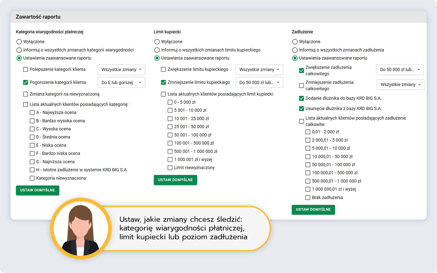 Zdecyduj, jakie zmiany chcesz śledzić: Kategorię Wiarygodności Płatniczej, limit kupiecki lub poziom zadłużenia.
